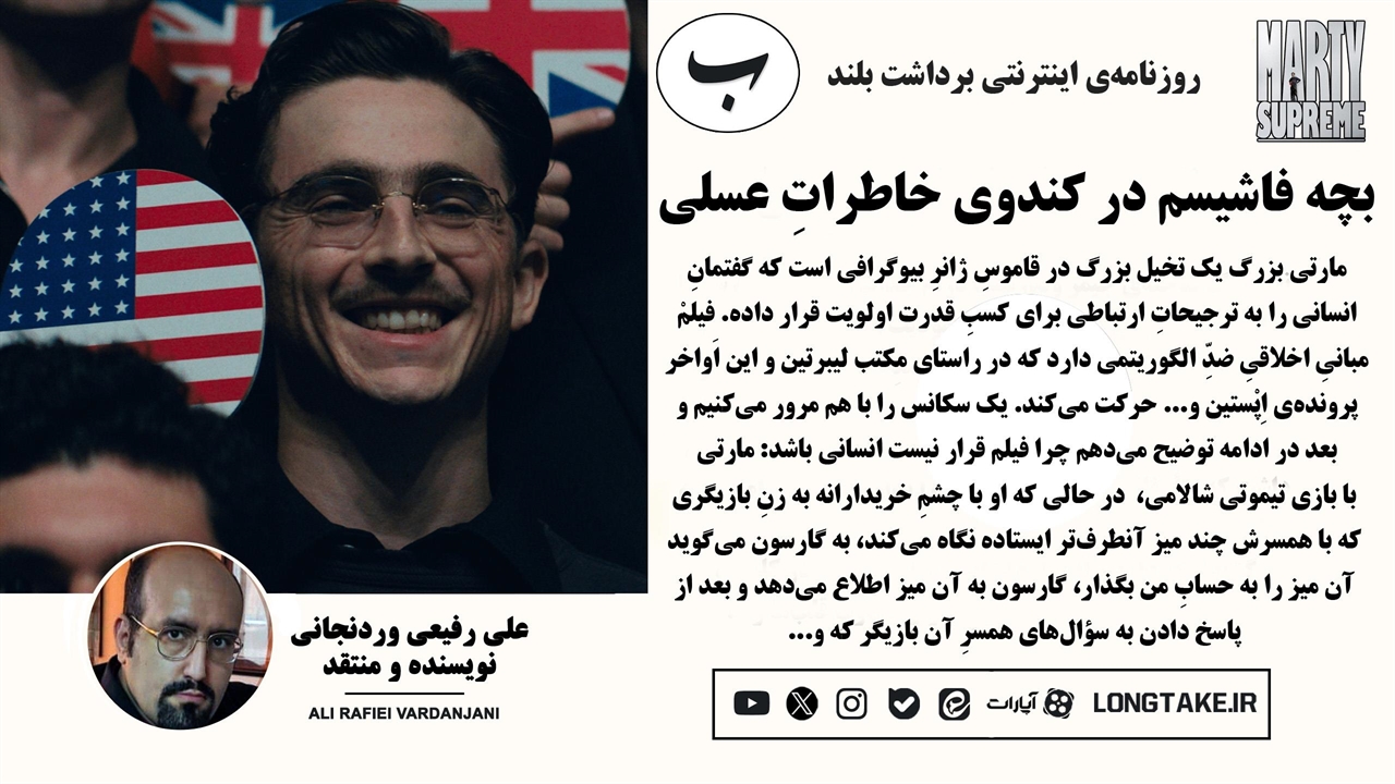 مارتی بزرگ یک تخیل بزرگ در قاموسِ ژانرِ بیوگرافی است که گفتمانِ انسانی را به ترجیحاتِ ارتباطی برای کسبِ قدرت اولویت قرار داده. فیلمْ مبانیِ اخلاقیِ ضدِّ الگوریتمی دارد که در راستای مکتب لیبرتین و این اَواخر پرونده‌ی اِپْستین و... حرکت می‌کند. یک سکانس را با هم مرور می‌کنیم و بعد در ادامه توضیح می‌دهم چرا فیلم قرار نیست انسانی باشد: مارتی، با بازی تیموتی شالامی، در حالی که او با چشمِ خریدارانه به زنِ بازیگری که با همسرش چند میز آنطرف‌تر ایستاده نگاه می‌کند، به گارسون می‌گوید آن میز را به حسابِ من بگذار، گارسون به آن میز اطلاع می‌دهد و بعد از پاسخ دادن به سؤال‌های همسرِ آن بازیگر که چه ربطی به تو دارد که میز ما را حساب می‌کنی مارتی از دوست‌اش، که روبه‌روی او نشسته، می‌خواهد خاطره‌ای از آشوئیتس و آلمان‌ها تعریف کند که او شروع می‌کند: یک زنبور را دنبال کردم تا کندویشان را پیدا کنم و پس از یافتن کندو عسل‌ها را به خودم مالیدم و شب که به سلول رفتم پیراهنم را درآوردم تا هم‌بندی‌هایم بدنم را لیس بزنند و... در همین سکانس که با فراز و نشیبِ فاشیسمی که به گُفته‌ی فلینی یعنی: به زور حق با من است، مواجه‌ایم. از کجا معلوم دوستِ مارتی قصّه‌ای سرِ هم نکرده باشد تا همسرِ خانم بازیگر را سرگرم دهد؟ و...