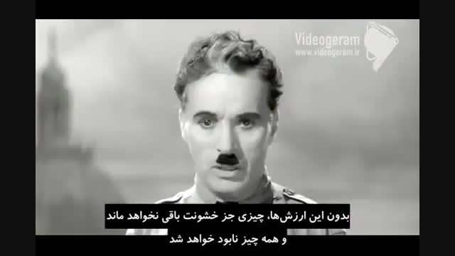 I’m sorry, but I don’t want to be an emperor. That’s not my business. I don’t want to rule or conquer anyone. I should like to help everyone - if possible - Jew, Gentile - black man - white. We all want to help one another. Human beings are like that. We want to live by each other’s happiness - not by each other’s misery. We don’t want to hate and despise one another. In this world there is room for everyone. And the good earth is rich and can provide for everyone. The way of life can be free and beautiful, but we have lost the way.متاسفم، من نمی‌خواهم بیش از این رهبر باشم، این کار من نیست من دوست دارم اگر امکانی باشد به هر کسی که می‌توانم کمک کنم یهودی، بی‌دین، سیاه یا سفید ما خواستار کمک به ‌یکدیگر هستیم، انسانیت چنین است ما همه خواهان آنیم که در شادی یکدیگر شریک باشیم و با هم زندگی کنیم، زندگی‌ایی فارغ از رنج و نکبت ما نمی‌خواهیم از یکدیگر متنفر باشیم و یکدیگر را تحقیر کنیم در این دنیا برای همه ما مکانی برای زندگی هست، این کره خاکی بقدر کافی غنی هست تا توشه و غذایی برای همه ما فراهم آورد।شیوه و مسیر زندگی می‌تواند آزاد و زیبا باشد، اما ما راه را گم کرده‌ایم