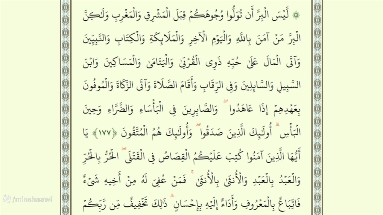 ۞ لَّیْسَ الْبِرَّ أَن تُوَلُّوا وُجُوهَکُمْ قِبَلَ الْمَشْرِقِ وَالْمَغْرِبِ وَلَٰکِنَّ الْبِرَّ مَنْ آمَنَ بِاللَّهِ وَالْیَوْمِ الْآخِرِ وَالْمَلَائِکَةِ وَالْکِتَابِ وَالنَّبِیِّینَ وَآتَى الْمَالَ عَلَىٰ حُبِّهِ ذَوِی الْقُرْبَىٰ وَالْیَتَامَىٰ وَالْمَسَاکِینَ وَابْنَ السَّبِیلِ وَالسَّائِلِینَ وَفِی الرِّقَابِ وَأَقَامَ الصَّلَاةَ وَآتَى الزَّکَاةَ وَالْمُوفُونَ بِعَهْدِهِمْ إِذَا عَاهَدُوا ۖ وَالصَّابِرِینَ فِی الْبَأْسَاءِ وَالضَّرَّاءِ وَحِینَ الْبَأْسِ ۗ أُولَٰئِکَ الَّذِینَ صَدَقُوا ۖ وَأُولَٰئِکَ هُمُ الْمُتَّقُونَ ﴿١٧٧﴾ یَا أَیُّهَا الَّذِینَ آمَنُوا کُتِبَ عَلَیْکُمُ الْقِصَاصُ فِی الْقَتْلَى ۖ الْحُرُّ بِالْحُرِّ وَالْعَبْدُ بِالْعَبْدِ وَالْأُنثَىٰ بِالْأُنثَىٰ ۚ فَمَنْ عُفِیَ لَهُ مِنْ أَخِیهِ شَیْءٌ فَاتِّبَاعٌ بِالْمَعْرُوفِ وَأَدَاءٌ إِلَیْهِ بِإِحْسَانٍ ۗ ذَٰلِکَ تَخْفِیفٌ مِّن رَّبِّکُمْ وَرَحْمَةٌ ۗ فَمَنِ اعْتَدَىٰ بَعْدَ ذَٰلِکَ فَلَهُ عَذَابٌ أَلِیمٌ ﴿١٧٨﴾ وَلَکُمْ فِی الْقِصَاصِ حَیَاةٌ یَا أُولِی الْأَلْبَابِ لَعَلَّکُمْ تَتَّقُونَ ﴿١٧٩﴾ کُتِبَ عَلَیْکُمْ إِذَا حَضَرَ أَحَدَکُمُ الْمَوْتُ إِن تَرَکَ خَیْرًا الْوَصِیَّةُ لِلْوَالِدَیْنِ وَالْأَقْرَبِینَ بِالْمَعْرُوفِ ۖ حَقًّا عَلَى الْمُتَّقِینَ ﴿١٨٠﴾ فَمَن بَدَّلَهُ بَعْدَ مَا سَمِعَهُ فَإِنَّمَا إِثْمُهُ عَلَى الَّذِینَ یُبَدِّلُونَهُ ۚ إِنَّ اللَّهَ سَمِیعٌ عَلِیمٌ ﴿١٨١﴾