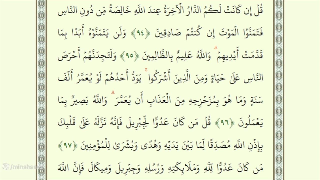 قُلْ إِن کَانَتْ لَکُمُ الدَّارُ الْآخِرَةُ عِندَ اللَّهِ خَالِصَةً مِّن دُونِ النَّاسِ فَتَمَنَّوُا الْمَوْتَ إِن کُنتُمْ صَادِقِینَ ﴿٩٤﴾ وَلَن یَتَمَنَّوْهُ أَبَدًا بِمَا قَدَّمَتْ أَیْدِیهِمْ ۗ وَاللَّهُ عَلِیمٌ بِالظَّالِمِینَ ﴿٩٥﴾ وَلَتَجِدَنَّهُمْ أَحْرَصَ النَّاسِ عَلَىٰ حَیَاةٍ وَمِنَ الَّذِینَ أَشْرَکُوا ۚ یَوَدُّ أَحَدُهُمْ لَوْ یُعَمَّرُ أَلْفَ سَنَةٍ وَمَا هُوَ بِمُزَحْزِحِهِ مِنَ الْعَذَابِ أَن یُعَمَّرَ ۗ وَاللَّهُ بَصِیرٌ بِمَا یَعْمَلُونَ ﴿٩٦﴾ قُلْ مَن کَانَ عَدُوًّا لِّجِبْرِیلَ فَإِنَّهُ نَزَّلَهُ عَلَىٰ قَلْبِکَ بِإِذْنِ اللَّهِ مُصَدِّقًا لِّمَا بَیْنَ یَدَیْهِ وَهُدًى وَبُشْرَىٰ لِلْمُؤْمِنِینَ ﴿٩٧﴾ مَن کَانَ عَدُوًّا لِّلَّهِ وَمَلَائِکَتِهِ وَرُسُلِهِ وَجِبْرِیلَ وَمِیکَالَ فَإِنَّ اللَّهَ عَدُوٌّ لِّلْکَافِرِینَ ﴿٩٨﴾ وَلَقَدْ أَنزَلْنَا إِلَیْکَ آیَاتٍ بَیِّنَاتٍ ۖ وَمَا یَکْفُرُ بِهَا إِلَّا الْفَاسِقُونَ ﴿٩٩﴾ أَوَکُلَّمَا عَاهَدُوا عَهْدًا نَّبَذَهُ فَرِیقٌ مِّنْهُم ۚ بَلْ أَکْثَرُهُمْ لَا یُؤْمِنُونَ ﴿١٠٠﴾ وَلَمَّا جَاءَهُمْ رَسُولٌ مِّنْ عِندِ اللَّهِ مُصَدِّقٌ لِّمَا مَعَهُمْ نَبَذَ فَرِیقٌ مِّنَ الَّذِینَ أُوتُوا الْکِتَابَ کِتَابَ اللَّهِ وَرَاءَ ظُهُورِهِمْ کَأَنَّهُمْ لَا یَعْلَمُونَ ﴿١٠١﴾