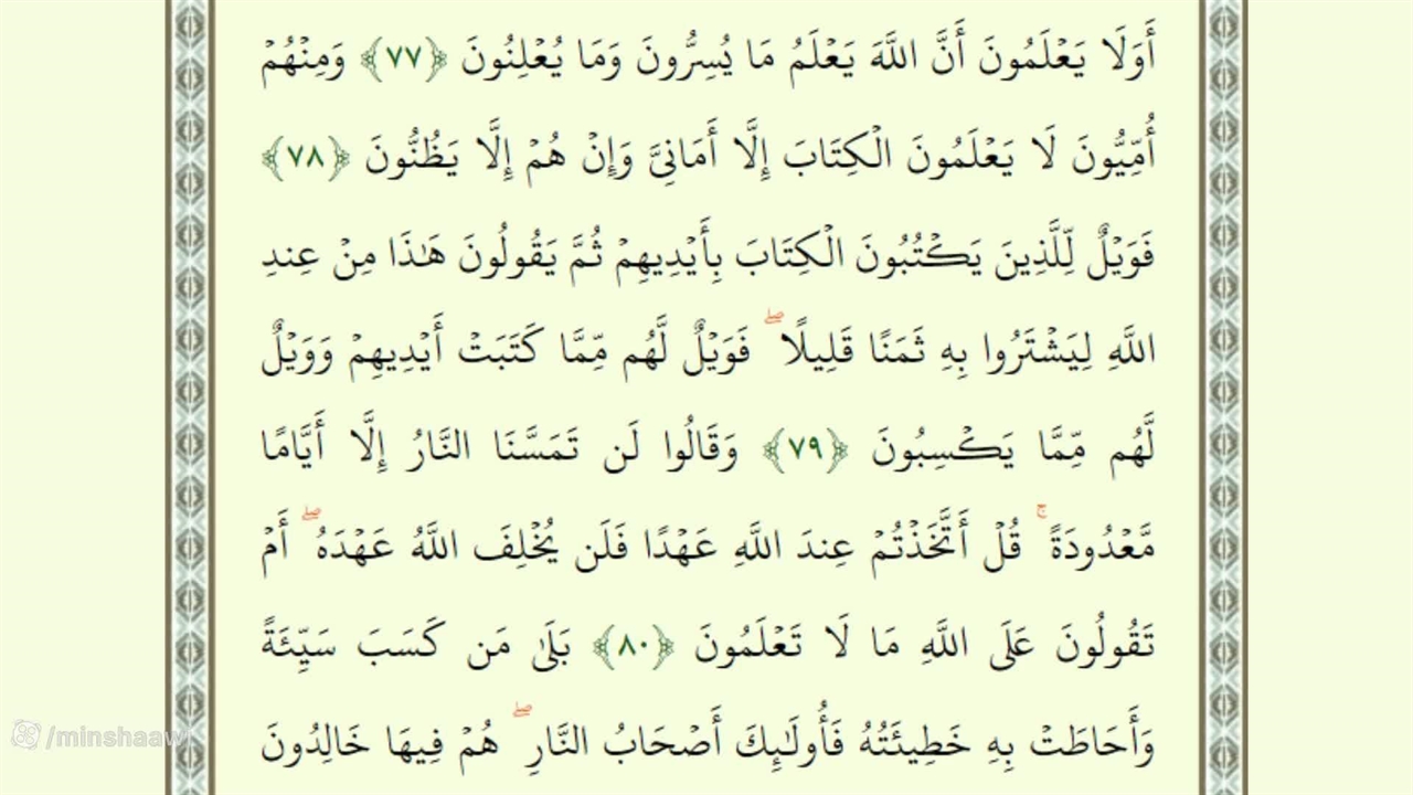أَوَلَا یَعْلَمُونَ أَنَّ اللَّهَ یَعْلَمُ مَا یُسِرُّونَ وَمَا یُعْلِنُونَ ﴿٧٧﴾ وَمِنْهُمْ أُمِّیُّونَ لَا یَعْلَمُونَ الْکِتَابَ إِلَّا أَمَانِیَّ وَإِنْ هُمْ إِلَّا یَظُنُّونَ ﴿٧٨﴾ فَوَیْلٌ لِّلَّذِینَ یَکْتُبُونَ الْکِتَابَ بِأَیْدِیهِمْ ثُمَّ یَقُولُونَ هَٰذَا مِنْ عِندِ اللَّهِ لِیَشْتَرُوا بِهِ ثَمَنًا قَلِیلًا ۖ فَوَیْلٌ لَّهُم مِّمَّا کَتَبَتْ أَیْدِیهِمْ وَوَیْلٌ لَّهُم مِّمَّا یَکْسِبُونَ ﴿٧٩﴾ وَقَالُوا لَن تَمَسَّنَا النَّارُ إِلَّا أَیَّامًا مَّعْدُودَةً ۚ قُلْ أَتَّخَذْتُمْ عِندَ اللَّهِ عَهْدًا فَلَن یُخْلِفَ اللَّهُ عَهْدَهُ ۖ أَمْ تَقُولُونَ عَلَى اللَّهِ مَا لَا تَعْلَمُونَ ﴿٨٠﴾ بَلَىٰ مَن کَسَبَ سَیِّئَةً وَأَحَاطَتْ بِهِ خَطِیئَتُهُ فَأُولَٰئِکَ أَصْحَابُ النَّارِ ۖ هُمْ فِیهَا خَالِدُونَ ﴿٨١﴾ وَالَّذِینَ آمَنُوا وَعَمِلُوا الصَّالِحَاتِ أُولَٰئِکَ أَصْحَابُ الْجَنَّةِ ۖ هُمْ فِیهَا خَالِدُونَ ﴿٨٢﴾ وَإِذْ أَخَذْنَا مِیثَاقَ بَنِی إِسْرَائِیلَ لَا تَعْبُدُونَ إِلَّا اللَّهَ وَبِالْوَالِدَیْنِ إِحْسَانًا وَذِی الْقُرْبَىٰ وَالْیَتَامَىٰ وَالْمَسَاکِینِ وَقُولُوا لِلنَّاسِ حُسْنًا وَأَقِیمُوا الصَّلَاةَ وَآتُوا الزَّکَاةَ ثُمَّ تَوَلَّیْتُمْ إِلَّا قَلِیلًا مِّنکُمْ وَأَنتُم مُّعْرِضُونَ ﴿٨٣﴾