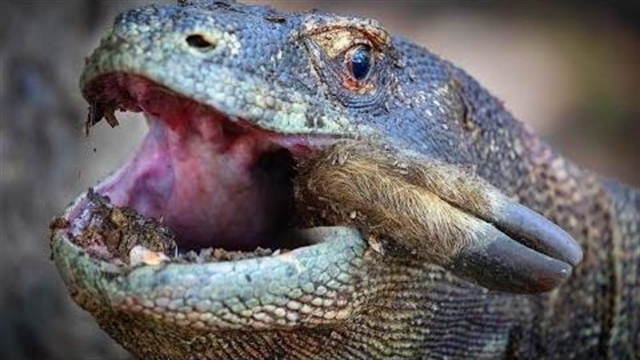 اژدهای کومودو بزرگترین مارمولک دنیا، در حال بلعیدن حیوانات
