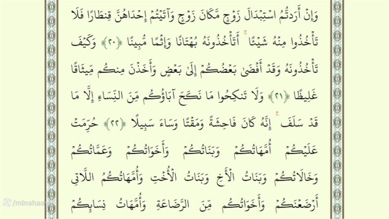 وَإِنْ أَرَدتُّمُ اسْتِبْدَالَ زَوْجٍ مَّکَانَ زَوْجٍ وَآتَیْتُمْ إِحْدَاهُنَّ قِنطَارًا فَلَا تَأْخُذُوا مِنْهُ شَیْئًا ۚ أَتَأْخُذُونَهُ بُهْتَانًا وَإِثْمًا مُّبِینًا ﴿٢٠﴾ وَکَیْفَ تَأْخُذُونَهُ وَقَدْ أَفْضَىٰ بَعْضُکُمْ إِلَىٰ بَعْضٍ وَأَخَذْنَ مِنکُم مِّیثَاقًا غَلِیظًا ﴿٢١﴾ وَلَا تَنکِحُوا مَا نَکَحَ آبَاؤُکُم مِّنَ النِّسَاءِ إِلَّا مَا قَدْ سَلَفَ ۚ إِنَّهُ کَانَ فَاحِشَةً وَمَقْتًا وَسَاءَ سَبِیلًا ﴿٢٢﴾ حُرِّمَتْ عَلَیْکُمْ أُمَّهَاتُکُمْ وَبَنَاتُکُمْ وَأَخَوَاتُکُمْ وَعَمَّاتُکُمْ وَخَالَاتُکُمْ وَبَنَاتُ الْأَخِ وَبَنَاتُ الْأُخْتِ وَأُمَّهَاتُکُمُ اللَّاتِی أَرْضَعْنَکُمْ وَأَخَوَاتُکُم مِّنَ الرَّضَاعَةِ وَأُمَّهَاتُ نِسَائِکُمْ وَرَبَائِبُکُمُ اللَّاتِی فِی حُجُورِکُم مِّن نِّسَائِکُمُ اللَّاتِی دَخَلْتُم بِهِنَّ فَإِن لَّمْ تَکُونُوا دَخَلْتُم بِهِنَّ فَلَا جُنَاحَ عَلَیْکُمْ وَحَلَائِلُ أَبْنَائِکُمُ الَّذِینَ مِنْ أَصْلَابِکُمْ وَأَن تَجْمَعُوا بَیْنَ الْأُخْتَیْنِ إِلَّا مَا قَدْ سَلَفَ ۗ إِنَّ اللَّهَ کَانَ غَفُورًا رَّحِیمًا ﴿٢٣﴾