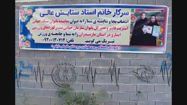 نصب پلاکارد تبریک به سرکار خانم استاد ستایش عالی نماینده بانوان سبک جهانی استریت فایتر در استان مازندران و دبیریت بانوان سازمان جهانی ثبت رکوردهای ورزشی ایمارو در استان مازندران از طرف شورای اسلامی و دهیاری روستای شهاب لیلم .
