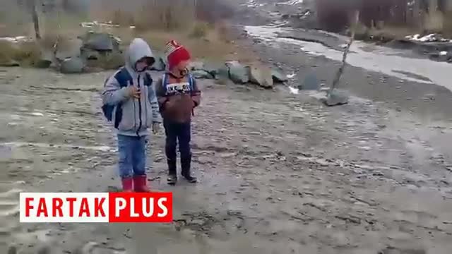 عبور دشوار دانش‌آموزان از رودخانه در "سوخسو انقلاب"