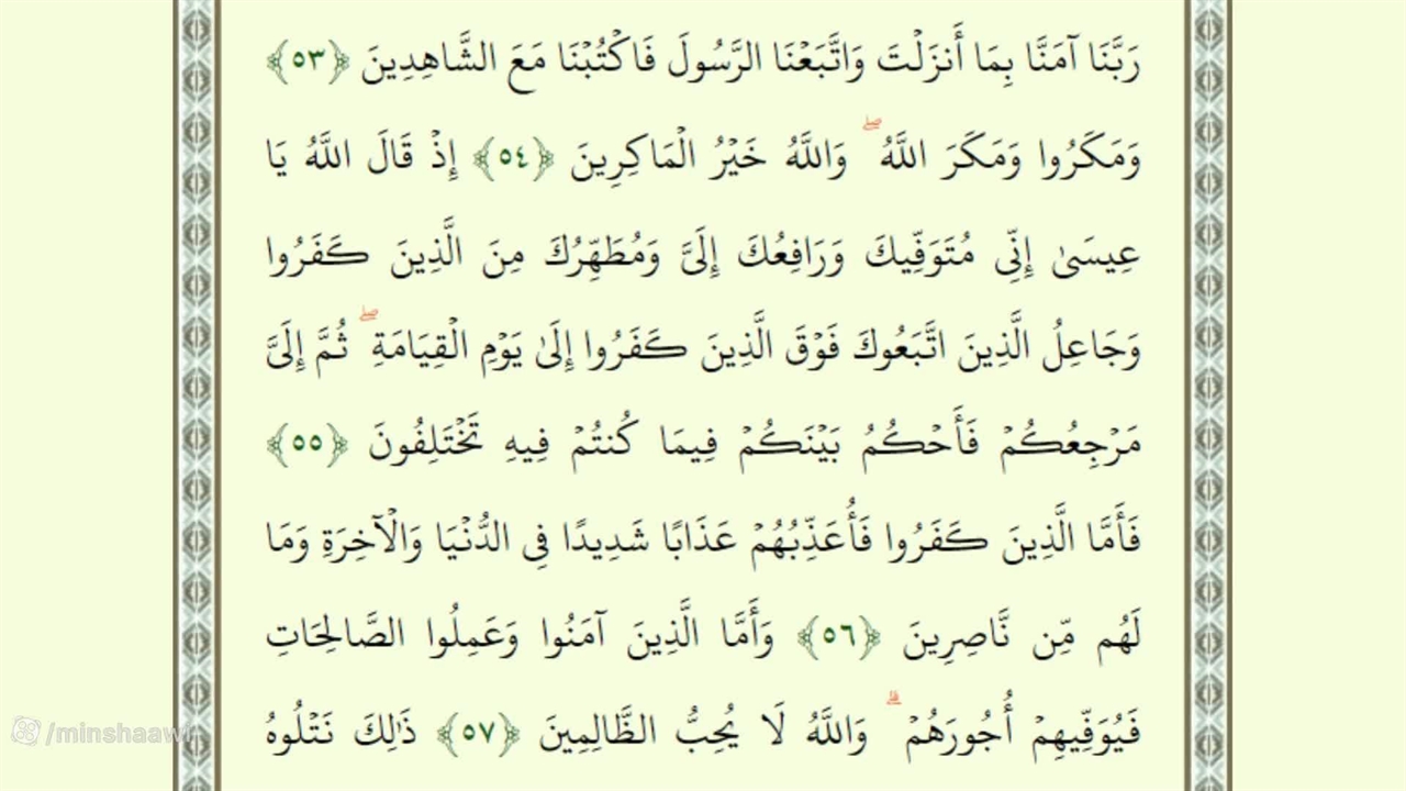 صفحه پنجاه و هفتم از جزء سوم قرآن با صدای استاد محمد صدیق منشاوی