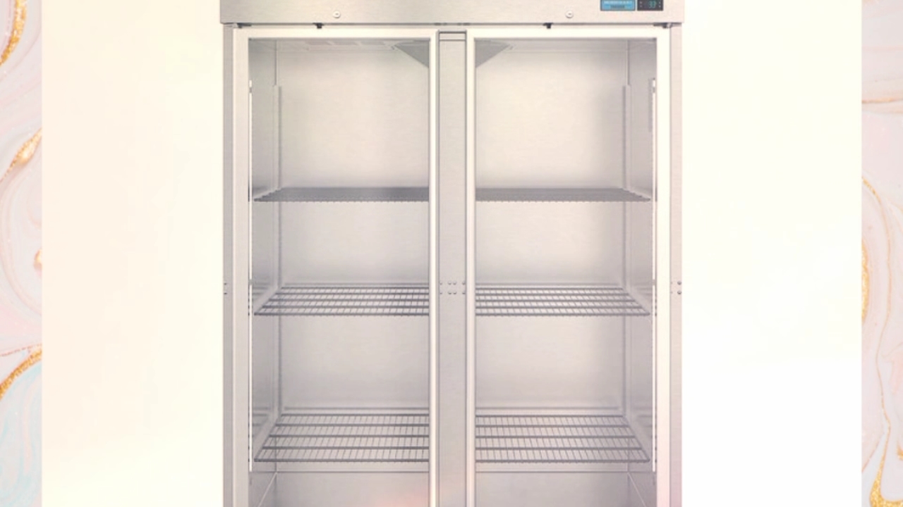 یخچال ایستاده دو درب که از دسته ی یخچال صنعتی می باشد دارای شیشه های دو جداره نشکن و ترموستات دیجیتال می باشد، که از این یخچال ایستاده در فروشگاه های مختلف اعم از لبنیاتی، فست فودی، رستوران، سوپرمارکت و هایپری ها استفاده می شود و متناسب با فضای فروشگاه، ابعاد آن انتخاب می گردد.