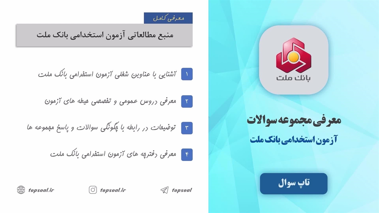 برای دانلود سوالات استخدامی بانک ملت از سایت تاپ سوال به لینک زیر مراجعه فرمایید: