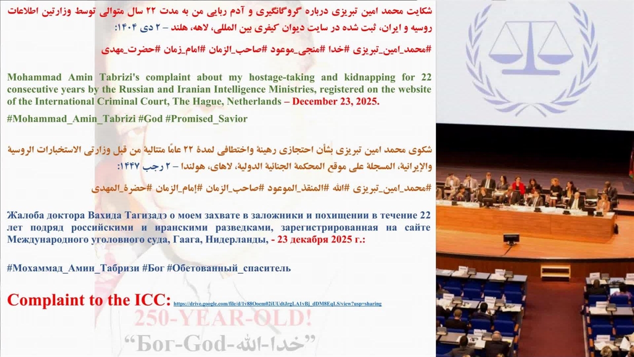 Mohammad Amin Tabrizi's complaint about my hostage-taking and kidnapping for 22 consecutive years by the Russian and Iranian Intelligence Ministries, registered on the website of the International Criminal Court, The Hague, Netherlands – December 23, 2025.
