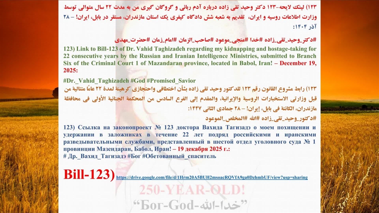 123) Ссылка на законопроект № 123 доктора Вахида Тагизадэ о моем похищении и удержании в заложниках в течение 22 лет подряд российскими и иранскими разведывательными службами, представленный в шестой отдел уголовного суда № 1 провинции Мазендаран, Бабол, Иран! – 19 декабря 2025 г.: