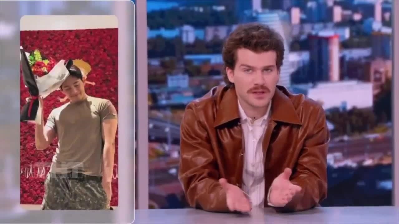 مجری برنامه عکسهایی رو که تهیونگ تو اینستاگرام گذاشته بود نشون داده و دربارهی برنامههاش برای افزایش حجم عضلاتش هم توضیح داده. کل دنیا منتظر برگشتن بنگتنن