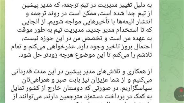 *به دلیل تغییر مدیریت در تیم ترجمه، که مدیر پیشین از تیم جدا شده است، ممکن است در روند ترجمه و انتشار انیمهها با تأخیرهایی مواجه شویم. از آنجایی که تا استخدام مدیر جدید، مدیریت تیم به طور موقت به عهده من است و تخصص من در این حوزه نیست، احتمال بروز تاخیر وجود دارد. عذرخواهی میکنم و تمام تلاشم را میکنم تا این موضوع هرچه زودتر حل شود.
