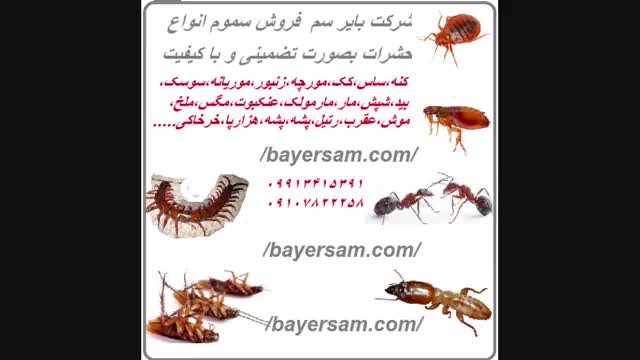 شرکت بایر سم فروش و ارسال سم انواع حشرات از قبیل سم سوسک،سم عقرب،سم ملخ،سم پشه،سم موریانه،سم کک،سم کنه،سم ساس،سم مورچه،سم مگس،سم موش،سم مارمولک،سم رتیل،سم زنبور،سم مار، سم بید،سم عنکبوت،سم شپش ،سم هزارپاوسم سایر حشرات و جانداران موذی و مزاحم که از دست آنها به ستوه آمده اید این سموم با ترکیبات فوق العاده قوی محصول شرکت بایر سم میباشد یک روش کاملا موثر برای ریشه کن کردن حشرات و حیوانات موذی و مزاحم میباشد با کیفیت و تضمینی ارسال به تمام شهرها برای خرید سم کشنده حشرات با مشاورین شرکت بایر سم تماس بگیرید