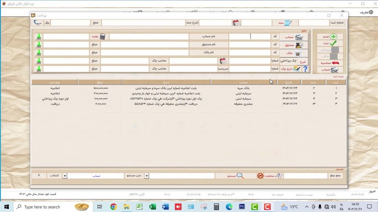 ثبت پرداخت در حالت حواله و چک پرداختی در نرم افزار یاپراق