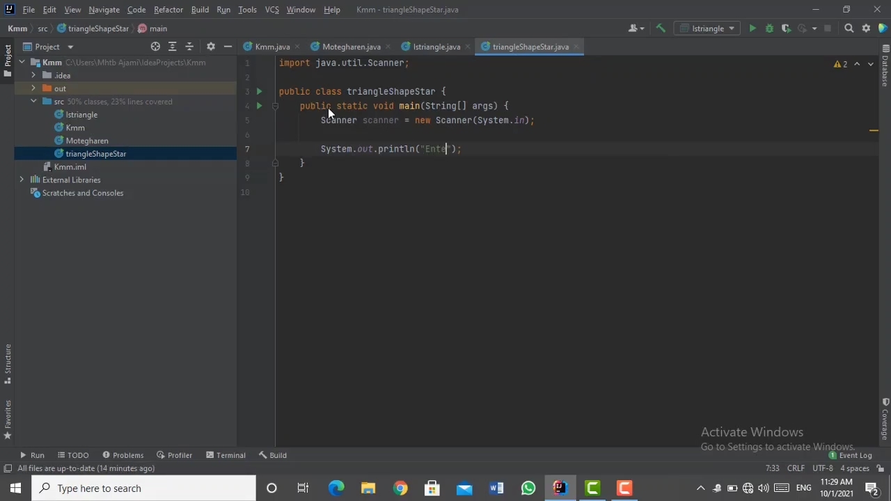 برنامه ای به زبان جاوا بنویسید یک عدد مانند n از ورودی بگیرد و مثلث قائم الزاویه را با کاراکتر ستاره در خروجی چاپ کند.عدد n ارتفاع مثلث یا تعداد سطرهای چاپ ستاره را مشخص میکند.