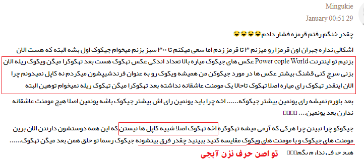 "بزنی گوگل میگه پاورکاپل جیکوکه، بعد اووَخ تهکوکرا میگن تهکوک ریله..." ــــ مود من:| خب گوگل و توییت هشتگایی که واسش زدنو میاره بالا. شاید تهکوکرا نخواستن هی تهکوک هشتگ پاورکاپل بزنن. وگرنه اصلا میدونی معنی پاورکاپل چیه؟ بیا تا واست توضیح بدم جانم: یعنی توی کنسرت هری درحالی که ویکوکمین کنار هم ایستادن، این تهکوک باشن که باهم بنوشن و بهم لم بدن و باهم برقصن. و اون شب تا چندین ساعت #تهکوک ترند جهانی بود. دقت کن. ترند جحاااانیییییی.تکرار کن:جهانی. جهانی. جهانی. پاورکاپل یعنی این. نه اینکه دوتا هشتگ نشون دهنده ریل بودن کاپلی بشه.