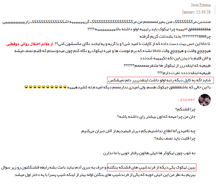 "هیچ وَخ نرفتم مومنتا و عکسای تکوکو نگاه کنم چون قلبم نصف میشه" ـــ اینکه تکوک مومنت بده و شما ناراحت بشی نشون دهنده اینه که درکی از رابطه اعضا نداری. اسم خودتم نزار آرمی یا حتی جیکوکر. چون جیکوک همچین اهانتایی رو نسبت به روابطشون(منظورم روابط بین همه اعضاس) نمیپذیره.