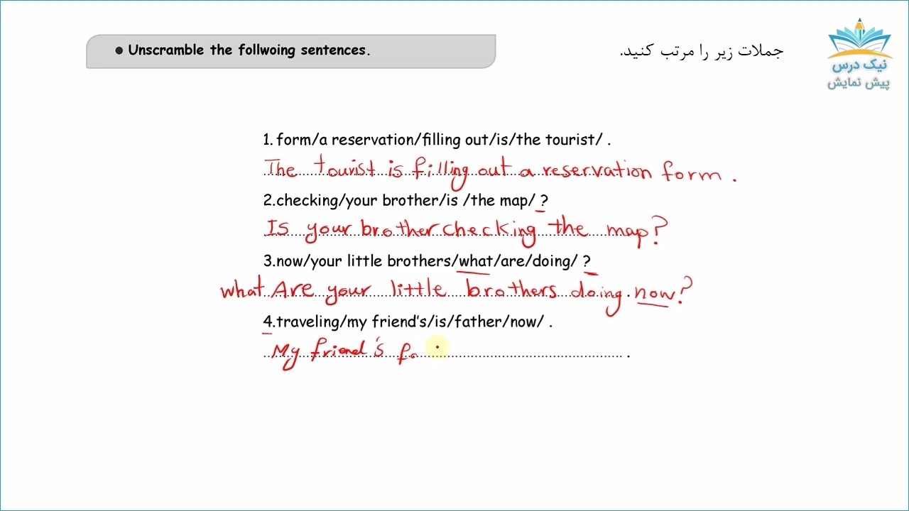 در درس اول در قالب تمرین، با افعال to bo جملاتی را ساخته و به تکمیل جملات حال استمراری می پردازیم. در ادامه جملات بهم ریخته را طبق فرمول جمله سازی مرتب نموده و جمله مربوط به هر تصویر را به زمان حال استمراری نوشته و همچنین جدول کلمات متقاطع و متن های دارای غلط گرامری را نیز اصلاح می کنیم.