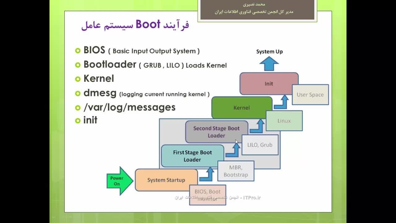 در این ویدیوی آموزشی ما به صورت ویژه به بررسی نحوه و فرآیند Boot شدن سیستم عامل لینوکس و بعضا محلی که می توانیم به دنبال رفع اشکال Boot آن باشیم اشاره می کنیم. در این ویدیوی آموزشی ابتدا ما فرآیند Boot شدن سیستم عامل های مختلف در مراحل مشترک را به شما آموزش می دهیم و بصورت ویژه به لینوکس می پردازیم ، به معرفی انواع Boot Loader و ماهیت کاری آن می پردازیم ، تفاوت بین LILO و GRUB را برای شما تشریح می کنیم و به معرفی نحوه Boot و Load شدن هسته سیستم عامل لینوکس توسط GRUB اشاره می کنیم .