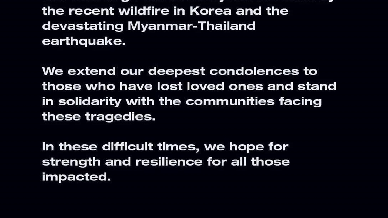 "دلمون با همه کسایی عه که از آتش سوزی اخیر جنگل ها توی کره و زلزله وحشتناک میانمار و تایلند آسیب دیدن . عمیق ترین تسلیت هامون رو به کسایی که عزیزانشون رو از دست دادن ابراز میکنیم و با جوامعی که با این فاجعه ها روبرو هستن همدردی میکنیم . توی این روزهای سخت، برای همه آسیب دیدهها آرزوی صبر و استقامت داریم "