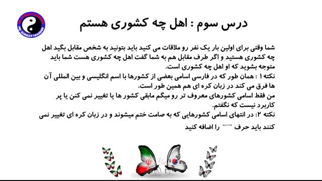 بابت تاخیرمون یه کمی عذر می خوام دیگه اینکه این کلیپ به شما آموزش میده چطور بگین اهل چه کشوری هستین و اسامی کشورها در زبان کره ای چی هست