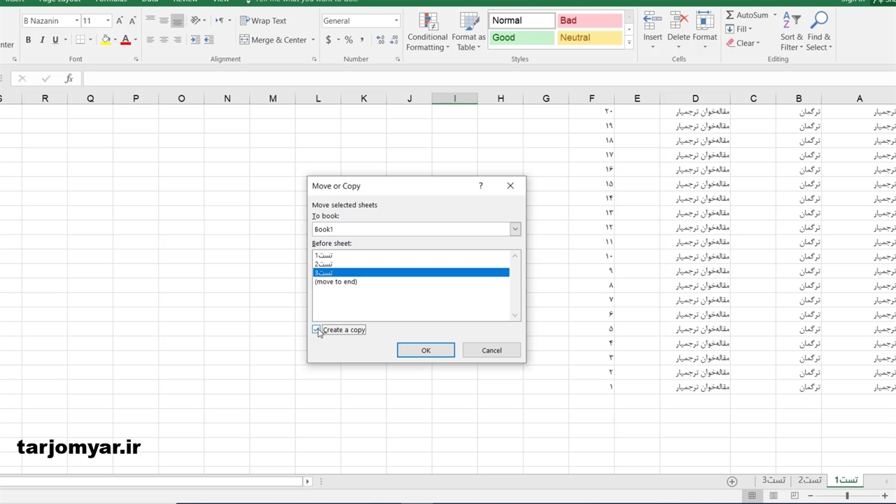 نکته: همچنین میتونید به جای تب، اطلاعات شیت رو به یک فایل اکسل کاملا جدا منتقل کنید. برای این کار در پنجره بازشده در بخشTo book میتونید فایل اکسل مورد نظرتون رو از لیست فایلها انتخاب کنید