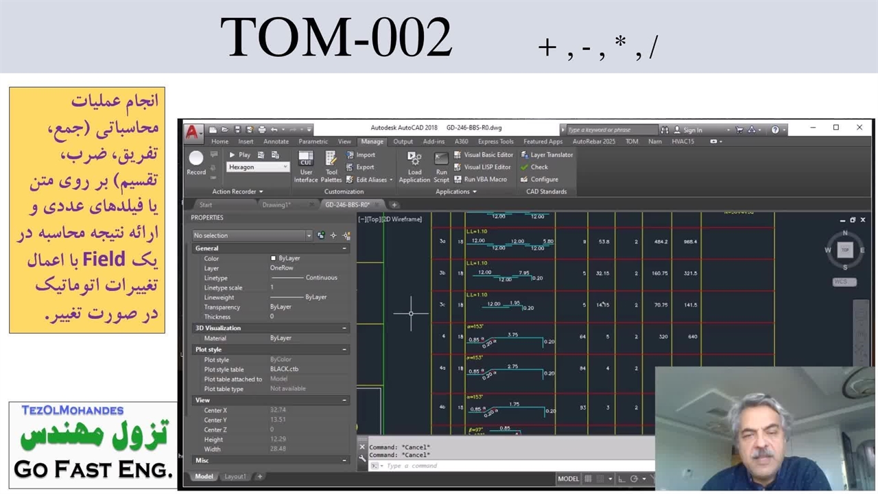 در محیط AutoCAD با انتخاب اعداد درج شده در نقشه (بصورت Text، MTEXT، Attribute) میتوان با این برنامه، چهار عمل اصلی (جمع، تفریق، ضرب و تقسیم) را بر روی اعداد انتخاب شده انجام داده و نتیجه حاصل در فرمت Field درج گردد.