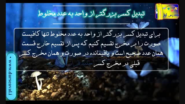 فیلم آموزشی اعداد مخلوط ریاضی پایه پنجم دبستان همراه با مثال با موضوعات تبدیل عدد مخلوط به کسر و تبدیل کسر بزرگتر از واحد به عدد مخلوط.