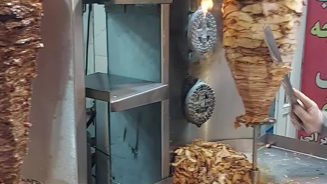 https://ashpazkhaneha.com/category/fastfood-equipment/device-turkish-doner-kabab/ ساندویچی سوریه ای شاورما که غذاهای عربی سرو میکنن رستوران امپراطور در محله عربی دولت آباد تهران که شاورمای گوشت و مرغ و فلافل سمبوسه کبه سوریه ای برای مشتریاشون داخل مغازه کوچیکی با میزوصندلی های پلاستیکی سرو میکنن