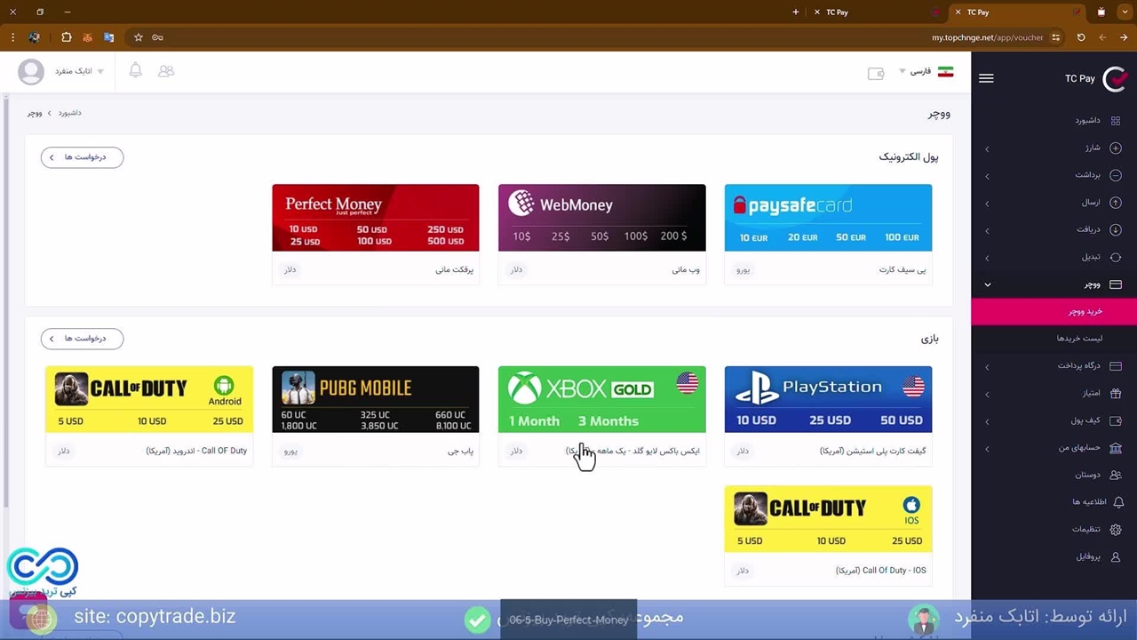 01:36 ورود به بخش خرید ووچر پرفکت مانی