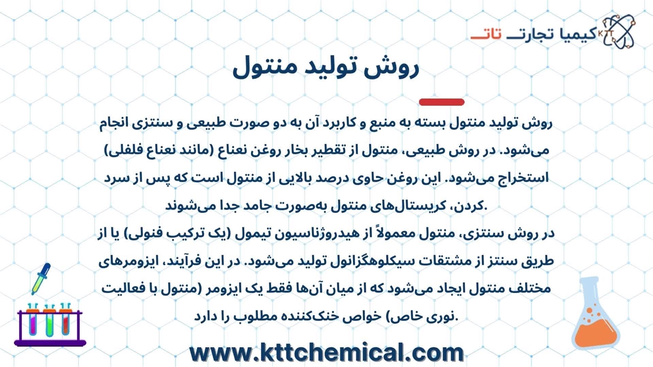 کیمیا تجارت تات با عرضه مستقیم منتول خالص از برندهای شناختهشده بینالمللی، امکان خرید عمده و جزئی با قیمت رقابتی را فراهم کرده است. این مجموعه ضمن ارائه آنالیز معتبر و مشاوره تخصصی، محصولاتی با اصالت تضمینشده را در کوتاهترین زمان به دست مصرفکننده میرساند. تجربه و تخصص تیم فنی کیمیا تجارت تات، خریدی مطمئن و بدون ریسک را برای شما تضمین میکند.