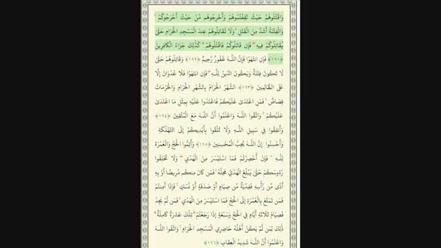 وَاقْتُلُوهُمْ حَیْثُ ثَقِفْتُمُوهُمْ وَأَخْرِجُوهُم مِّنْ حَیْثُ أَخْرَجُوکُمْ ۚ وَالْفِتْنَةُ أَشَدُّ مِنَ الْقَتْلِ ۚ وَلَا تُقَاتِلُوهُمْ عِندَ الْمَسْجِدِ الْحَرَامِ حَتَّىٰ یُقَاتِلُوکُمْ فِیهِ ۖ فَإِن قَاتَلُوکُمْ فَاقْتُلُوهُمْ ۗ کَذَٰلِکَ جَزَاءُ الْکَافِرِینَ ﴿١٩١﴾ فَإِنِ انتَهَوْا فَإِنَّ اللَّـهَ غَفُورٌ رَّحِیمٌ ﴿١٩٢﴾ وَقَاتِلُوهُمْ حَتَّىٰ لَا تَکُونَ فِتْنَةٌ وَیَکُونَ الدِّینُ لِلَّـهِ ۖ فَإِنِ انتَهَوْا فَلَا عُدْوَانَ إِلَّا عَلَى الظَّالِمِینَ ﴿١٩٣﴾ الشَّهْرُ الْحَرَامُ بِالشَّهْرِ الْحَرَامِ وَالْحُرُمَاتُ قِصَاصٌ ۚ فَمَنِ اعْتَدَىٰ عَلَیْکُمْ فَاعْتَدُوا عَلَیْهِ بِمِثْلِ مَا اعْتَدَىٰ عَلَیْکُمْ ۚ وَاتَّقُوا اللَّـهَ وَاعْلَمُوا أَنَّ اللَّـهَ مَعَ الْمُتَّقِینَ ﴿١٩٤﴾ وَأَنفِقُوا فِی سَبِیلِ اللَّـهِ وَلَا تُلْقُوا بِأَیْدِیکُمْ إِلَى التَّهْلُکَةِ ۛ وَأَحْسِنُوا ۛ إِنَّ اللَّـهَ یُحِبُّ الْمُحْسِنِینَ ﴿١٩٥﴾ وَأَتِمُّوا الْحَجَّ وَالْعُمْرَةَ لِلَّـهِ ۚ فَإِنْ أُحْصِرْتُمْ فَمَا اسْتَیْسَرَ مِنَ الْهَدْیِ ۖ وَلَا تَحْلِقُوا رُءُوسَکُمْ حَتَّىٰ یَبْلُغَ الْهَدْیُ مَحِلَّهُ ۚ فَمَن کَانَ مِنکُم مَّرِیضًا أَوْ بِهِ أَذًى مِّن رَّأْسِهِ فَفِدْیَةٌ مِّن صِیَامٍ أَوْ صَدَقَةٍ أَوْ نُسُکٍ ۚ فَإِذَا أَمِنتُمْ فَمَن تَمَتَّعَ بِالْعُمْرَةِ إِلَى الْحَجِّ فَمَا اسْتَیْسَرَ مِنَ الْهَدْیِ ۚ فَمَن لَّمْ یَجِدْ فَصِیَامُ ثَلَاثَةِ أَیَّامٍ فِی الْحَجِّ وَسَبْعَةٍ إِذَا رَجَعْتُمْ ۗ تِلْکَ عَشَرَةٌ کَامِلَةٌ ۗ ذَٰلِکَ لِمَن لَّمْ یَکُنْ أَهْلُهُ حَاضِرِی الْمَسْجِدِ الْحَرَامِ ۚ وَاتَّقُوا اللَّـهَ وَاعْلَمُوا أَنَّ اللَّـهَ شَدِیدُ الْعِقَابِ ﴿١٩٦﴾