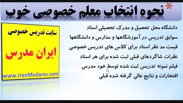 معیارهای مهم برای انتخاب یک استاد و معلم خصوصی خوب در این ویدیو توضیح داده شده است. مطالعه مقاله https://teaching.iranmodares.com/article.php?ID=206 از سایت تدریس خصوصی ایران مدرس هم می تواند در این زمینه مفید باشد. برخی از اساتید ثبت نامی در ایران مدرس برای دروس تدریسی خودشان جزوه و خلاصه جزوه هم ثبت کرده اند. هم می توانید از این جزوه ها برای یادگیری بهتر دروس استفاده کنید و هم اینکه با توجه به جزوه ارائه شده دیدی نسبت به روش تدریس استاد و روند تدریس ایشان پیدا کنید. همه ی موارد ذکر شده را می توانید در نظر داشته باشید و با توجه به این موارد یک معلم خصوصی خوب برای خودتان انتخاب نمائید. نکته دیگر اینکه اساتید ثبت نامی در این وب سایت تبلیغ خودشان را به دو صورت رایگان و ویژه ثبت کرده اند. اساتیدی که آگهی ویژه تدریس خصوصی دارند و تعدادی از آنها را در پایین همین صفحه هم مشاهده می کنید معمولا در کار تدریس جدی تر هستند و بنابراین توصیه می شود معلم خودتان را از بین این اساتید انتخاب نمائید. پس زمینه آگهی های تدریس ویژه به رنگ طلایی مشخص شده است. https://www.iranmodares.com/index.php