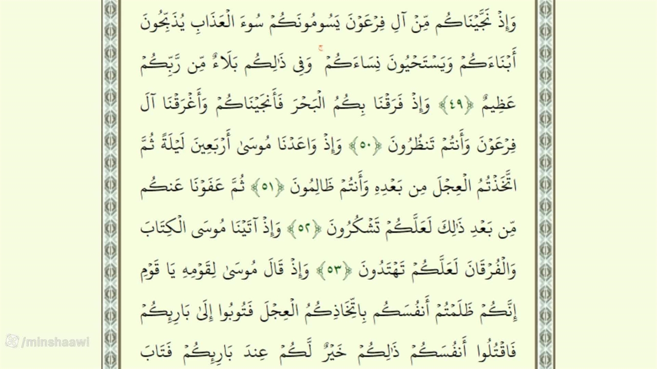 وَإِذْ نَجَّیْنَاکُم مِّنْ آلِ فِرْعَوْنَ یَسُومُونَکُمْ سُوءَ الْعَذَابِ یُذَبِّحُونَ أَبْنَاءَکُمْ وَیَسْتَحْیُونَ نِسَاءَکُمْ ۚ وَفِی ذَٰلِکُم بَلَاءٌ مِّن رَّبِّکُمْ عَظِیمٌ ﴿٤٩﴾ وَإِذْ فَرَقْنَا بِکُمُ الْبَحْرَ فَأَنجَیْنَاکُمْ وَأَغْرَقْنَا آلَ فِرْعَوْنَ وَأَنتُمْ تَنظُرُونَ ﴿٥٠﴾ وَإِذْ وَاعَدْنَا مُوسَىٰ أَرْبَعِینَ لَیْلَةً ثُمَّ اتَّخَذْتُمُ الْعِجْلَ مِن بَعْدِهِ وَأَنتُمْ ظَالِمُونَ ﴿٥١﴾ ثُمَّ عَفَوْنَا عَنکُم مِّن بَعْدِ ذَٰلِکَ لَعَلَّکُمْ تَشْکُرُونَ ﴿٥٢﴾ وَإِذْ آتَیْنَا مُوسَى الْکِتَابَ وَالْفُرْقَانَ لَعَلَّکُمْ تَهْتَدُونَ ﴿٥٣﴾ وَإِذْ قَالَ مُوسَىٰ لِقَوْمِهِ یَا قَوْمِ إِنَّکُمْ ظَلَمْتُمْ أَنفُسَکُم بِاتِّخَاذِکُمُ الْعِجْلَ فَتُوبُوا إِلَىٰ بَارِئِکُمْ فَاقْتُلُوا أَنفُسَکُمْ ذَٰلِکُمْ خَیْرٌ لَّکُمْ عِندَ بَارِئِکُمْ فَتَابَ عَلَیْکُمْ ۚ إِنَّهُ هُوَ التَّوَّابُ الرَّحِیمُ ﴿٥٤﴾ وَإِذْ قُلْتُمْ یَا مُوسَىٰ لَن نُّؤْمِنَ لَکَ حَتَّىٰ نَرَى اللَّهَ جَهْرَةً فَأَخَذَتْکُمُ الصَّاعِقَةُ وَأَنتُمْ تَنظُرُونَ ﴿٥٥﴾ ثُمَّ بَعَثْنَاکُم مِّن بَعْدِ مَوْتِکُمْ لَعَلَّکُمْ تَشْکُرُونَ ﴿٥٦﴾ وَظَلَّلْنَا عَلَیْکُمُ الْغَمَامَ وَأَنزَلْنَا عَلَیْکُمُ الْمَنَّ وَالسَّلْوَىٰ ۖ کُلُوا مِن طَیِّبَاتِ مَا رَزَقْنَاکُمْ ۖ وَمَا ظَلَمُونَا وَلَٰکِن کَانُوا أَنفُسَهُمْ یَظْلِمُونَ ﴿٥٧﴾