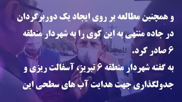 در این بازدید شهردار تبریز دستور پیگیری زیرسازی و آسفالت ریزی خیابان های این کوی و همچنین مطالعه بر روی ایجاد یک دوربرگردان در جاده منتهی به این کوی را به شهردار منطقه ۶ صادر کرد.