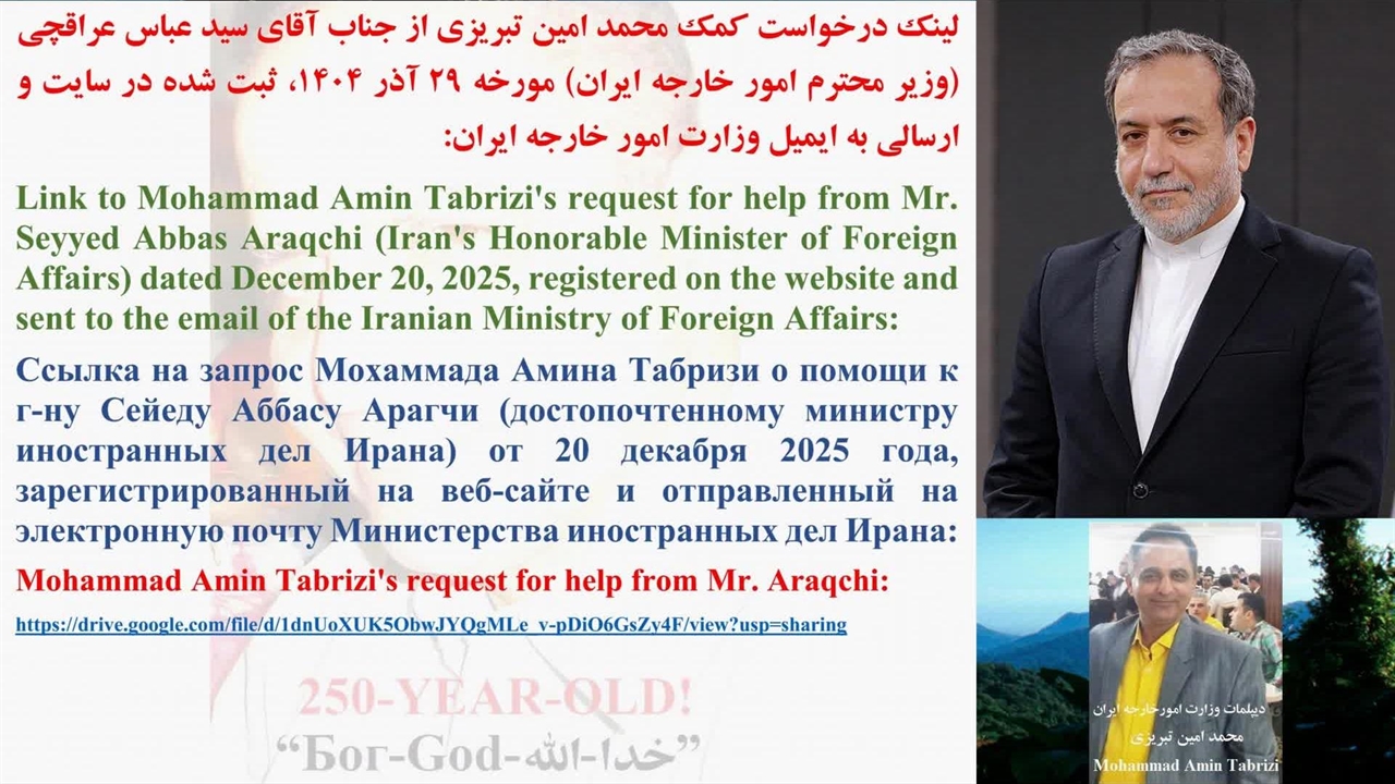 Ссылка на запрос Мохаммада Амина Табризи о помощи к г-ну Сейеду Аббасу Арагчи (достопочтенному министру иностранных дел Ирана) от 20 декабря 2025 года, зарегистрированный на веб-сайте и отправленный на электронную почту Министерства иностранных дел Ирана: