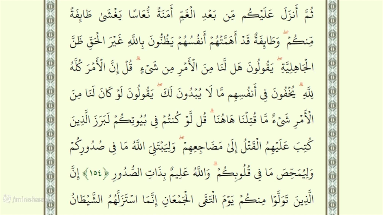 ثُمَّ أَنزَلَ عَلَیْکُم مِّن بَعْدِ الْغَمِّ أَمَنَةً نُّعَاسًا یَغْشَىٰ طَائِفَةً مِّنکُمْ ۖ وَطَائِفَةٌ قَدْ أَهَمَّتْهُمْ أَنفُسُهُمْ یَظُنُّونَ بِاللَّهِ غَیْرَ الْحَقِّ ظَنَّ الْجَاهِلِیَّةِ ۖ یَقُولُونَ هَل لَّنَا مِنَ الْأَمْرِ مِن شَیْءٍ ۗ قُلْ إِنَّ الْأَمْرَ کُلَّهُ لِلَّهِ ۗ یُخْفُونَ فِی أَنفُسِهِم مَّا لَا یُبْدُونَ لَکَ ۖ یَقُولُونَ لَوْ کَانَ لَنَا مِنَ الْأَمْرِ شَیْءٌ مَّا قُتِلْنَا هَاهُنَا ۗ قُل لَّوْ کُنتُمْ فِی بُیُوتِکُمْ لَبَرَزَ الَّذِینَ کُتِبَ عَلَیْهِمُ الْقَتْلُ إِلَىٰ مَضَاجِعِهِمْ ۖ وَلِیَبْتَلِیَ اللَّهُ مَا فِی صُدُورِکُمْ وَلِیُمَحِّصَ مَا فِی قُلُوبِکُمْ ۗ وَاللَّهُ عَلِیمٌ بِذَاتِ الصُّدُورِ ﴿١٥٤﴾ إِنَّ الَّذِینَ تَوَلَّوْا مِنکُمْ یَوْمَ الْتَقَى الْجَمْعَانِ إِنَّمَا اسْتَزَلَّهُمُ الشَّیْطَانُ بِبَعْضِ مَا کَسَبُوا ۖ وَلَقَدْ عَفَا اللَّهُ عَنْهُمْ ۗ إِنَّ اللَّهَ غَفُورٌ حَلِیمٌ ﴿١٥٥﴾ یَا أَیُّهَا الَّذِینَ آمَنُوا لَا تَکُونُوا کَالَّذِینَ کَفَرُوا وَقَالُوا لِإِخْوَانِهِمْ إِذَا ضَرَبُوا فِی الْأَرْضِ أَوْ کَانُوا غُزًّى لَّوْ کَانُوا عِندَنَا مَا مَاتُوا وَمَا قُتِلُوا لِیَجْعَلَ اللَّهُ ذَٰلِکَ حَسْرَةً فِی قُلُوبِهِمْ ۗ وَاللَّهُ یُحْیِی وَیُمِیتُ ۗ وَاللَّهُ بِمَا تَعْمَلُونَ بَصِیرٌ ﴿١٥٦﴾ وَلَئِن قُتِلْتُمْ فِی سَبِیلِ اللَّهِ أَوْ مُتُّمْ لَمَغْفِرَةٌ مِّنَ اللَّهِ وَرَحْمَةٌ خَیْرٌ مِّمَّا یَجْمَعُونَ ﴿١٥٧﴾