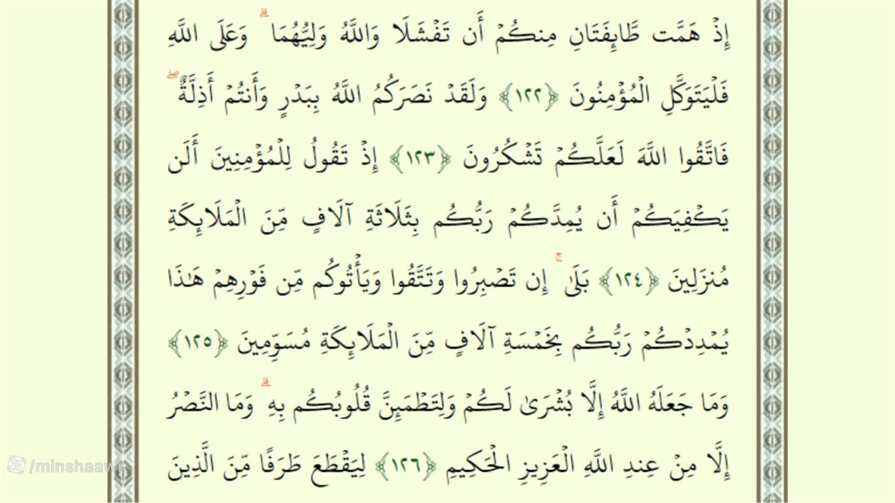 إِذْ هَمَّت طَّائِفَتَانِ مِنکُمْ أَن تَفْشَلَا وَاللَّهُ وَلِیُّهُمَا ۗ وَعَلَى اللَّهِ فَلْیَتَوَکَّلِ الْمُؤْمِنُونَ ﴿١٢٢﴾ وَلَقَدْ نَصَرَکُمُ اللَّهُ بِبَدْرٍ وَأَنتُمْ أَذِلَّةٌ ۖ فَاتَّقُوا اللَّهَ لَعَلَّکُمْ تَشْکُرُونَ ﴿١٢٣﴾ إِذْ تَقُولُ لِلْمُؤْمِنِینَ أَلَن یَکْفِیَکُمْ أَن یُمِدَّکُمْ رَبُّکُم بِثَلَاثَةِ آلَافٍ مِّنَ الْمَلَائِکَةِ مُنزَلِینَ ﴿١٢٤﴾ بَلَىٰ ۚ إِن تَصْبِرُوا وَتَتَّقُوا وَیَأْتُوکُم مِّن فَوْرِهِمْ هَٰذَا یُمْدِدْکُمْ رَبُّکُم بِخَمْسَةِ آلَافٍ مِّنَ الْمَلَائِکَةِ مُسَوِّمِینَ ﴿١٢٥﴾ وَمَا جَعَلَهُ اللَّهُ إِلَّا بُشْرَىٰ لَکُمْ وَلِتَطْمَئِنَّ قُلُوبُکُم بِهِ ۗ وَمَا النَّصْرُ إِلَّا مِنْ عِندِ اللَّهِ الْعَزِیزِ الْحَکِیمِ ﴿١٢٦﴾ لِیَقْطَعَ طَرَفًا مِّنَ الَّذِینَ کَفَرُوا أَوْ یَکْبِتَهُمْ فَیَنقَلِبُوا خَائِبِینَ ﴿١٢٧﴾ لَیْسَ لَکَ مِنَ الْأَمْرِ شَیْءٌ أَوْ یَتُوبَ عَلَیْهِمْ أَوْ یُعَذِّبَهُمْ فَإِنَّهُمْ ظَالِمُونَ ﴿١٢٨﴾ وَلِلَّهِ مَا فِی السَّمَاوَاتِ وَمَا فِی الْأَرْضِ ۚ یَغْفِرُ لِمَن یَشَاءُ وَیُعَذِّبُ مَن یَشَاءُ ۚ وَاللَّهُ غَفُورٌ رَّحِیمٌ ﴿١٢٩﴾ یَا أَیُّهَا الَّذِینَ آمَنُوا لَا تَأْکُلُوا الرِّبَا أَضْعَافًا مُّضَاعَفَةً ۖ وَاتَّقُوا اللَّهَ لَعَلَّکُمْ تُفْلِحُونَ ﴿١٣٠﴾ وَاتَّقُوا النَّارَ الَّتِی أُعِدَّتْ لِلْکَافِرِینَ ﴿١٣١﴾ وَأَطِیعُوا اللَّهَ وَالرَّسُولَ لَعَلَّکُمْ تُرْحَمُونَ ﴿١٣٢﴾