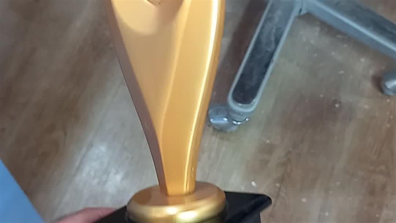 ساخته شده از رزین پلی استر و رنگ آمیزی طلایی با روکش کیلر پلی اورتان و پایه پلکسی شفاف چند لایه . تمامی مراحل از طراحی ، نمونه سازی ، ساخت قالب ، تولید و مونتاژ در تندیس سازی حریری انجام شده است