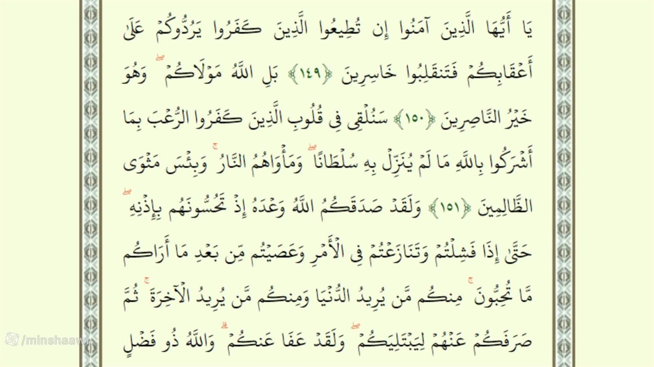 یَا أَیُّهَا الَّذِینَ آمَنُوا إِن تُطِیعُوا الَّذِینَ کَفَرُوا یَرُدُّوکُمْ عَلَىٰ أَعْقَابِکُمْ فَتَنقَلِبُوا خَاسِرِینَ ﴿١٤٩﴾ بَلِ اللَّهُ مَوْلَاکُمْ ۖ وَهُوَ خَیْرُ النَّاصِرِینَ ﴿١٥٠﴾ سَنُلْقِی فِی قُلُوبِ الَّذِینَ کَفَرُوا الرُّعْبَ بِمَا أَشْرَکُوا بِاللَّهِ مَا لَمْ یُنَزِّلْ بِهِ سُلْطَانًا ۖ وَمَأْوَاهُمُ النَّارُ ۚ وَبِئْسَ مَثْوَى الظَّالِمِینَ ﴿١٥١﴾ وَلَقَدْ صَدَقَکُمُ اللَّهُ وَعْدَهُ إِذْ تَحُسُّونَهُم بِإِذْنِهِ ۖ حَتَّىٰ إِذَا فَشِلْتُمْ وَتَنَازَعْتُمْ فِی الْأَمْرِ وَعَصَیْتُم مِّن بَعْدِ مَا أَرَاکُم مَّا تُحِبُّونَ ۚ مِنکُم مَّن یُرِیدُ الدُّنْیَا وَمِنکُم مَّن یُرِیدُ الْآخِرَةَ ۚ ثُمَّ صَرَفَکُمْ عَنْهُمْ لِیَبْتَلِیَکُمْ ۖ وَلَقَدْ عَفَا عَنکُمْ ۗ وَاللَّهُ ذُو فَضْلٍ عَلَى الْمُؤْمِنِینَ ﴿١٥٢﴾ ۞ إِذْ تُصْعِدُونَ وَلَا تَلْوُونَ عَلَىٰ أَحَدٍ وَالرَّسُولُ یَدْعُوکُمْ فِی أُخْرَاکُمْ فَأَثَابَکُمْ غَمًّا بِغَمٍّ لِّکَیْلَا تَحْزَنُوا عَلَىٰ مَا فَاتَکُمْ وَلَا مَا أَصَابَکُمْ ۗ وَاللَّهُ خَبِیرٌ بِمَا تَعْمَلُونَ ﴿١٥٣﴾