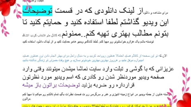 دوستان گلم برای اینکه تابع قوانین نماشا باشم و ویدیو حذف نشه نمیتونم ویدیو رو ب طور مستقیم در نماشا بزارم و با عرض شرمندگی حتی اسکرین شات هایی ک از ویدیو گرفتم رو با برنامه تار کردم اما مطمعن باشید که ویدیو اصلی اورجینال و کامل و با کیفیت واضح است