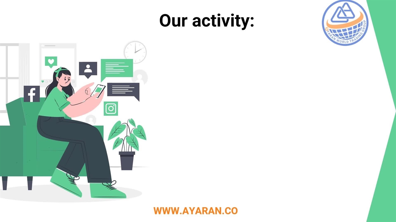 Ayaran World Trading Group is a management consulting, marketing, internet or digital marketing, business, and international marketing, business and commercial services including buying and selling, and after-sales service of authorized commercial goods, business and agency representation in the field of company activity, export and Import, clearance of goods, obtaining and granting representation inside and outside the country, establishment of domestic and international branches, within the framework of the laws and regulations of the organization