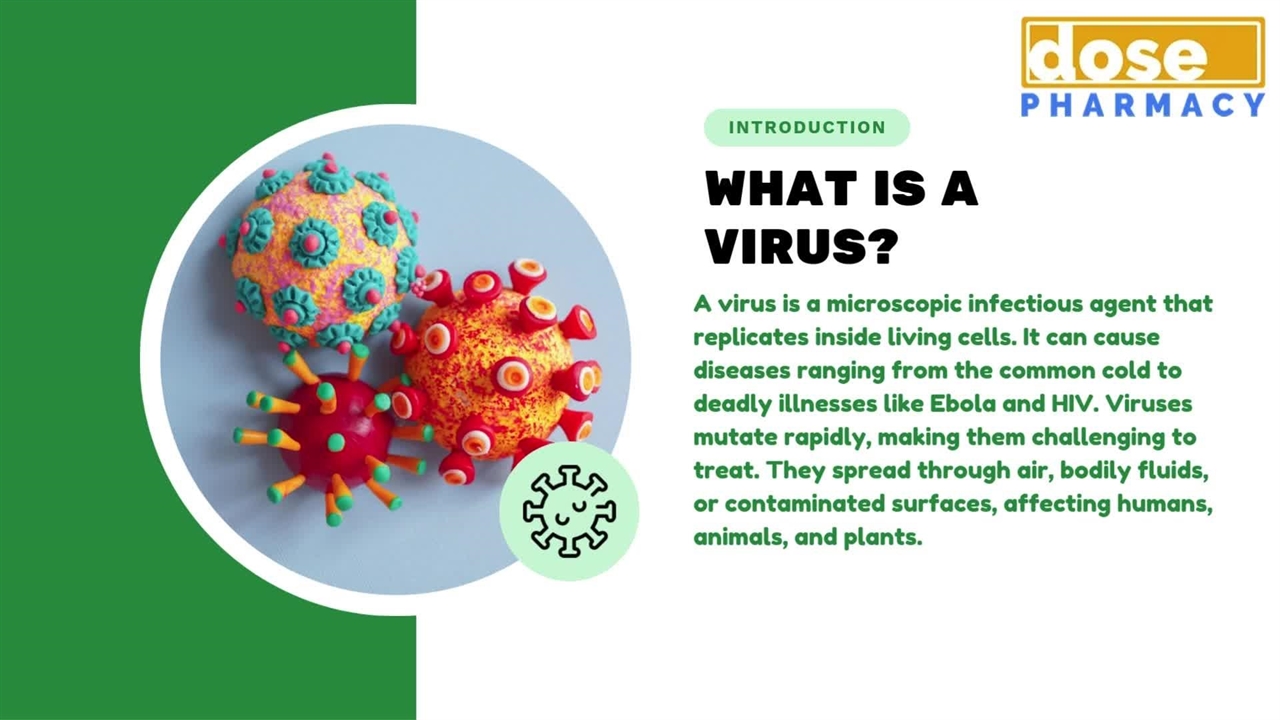 A virus is a tiny infectious agent made of genetic material (DNA or RNA) enclosed in a protein coat. It can't reproduce on its own and must invade living cells to multiply, often causing diseases in humans, animals, or plants.