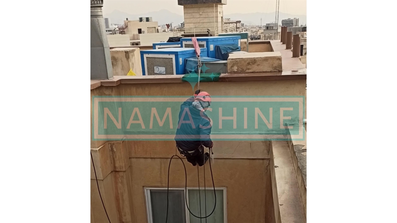 نماشویی نمای سیمانی ساختمان با طناب در نماشاین