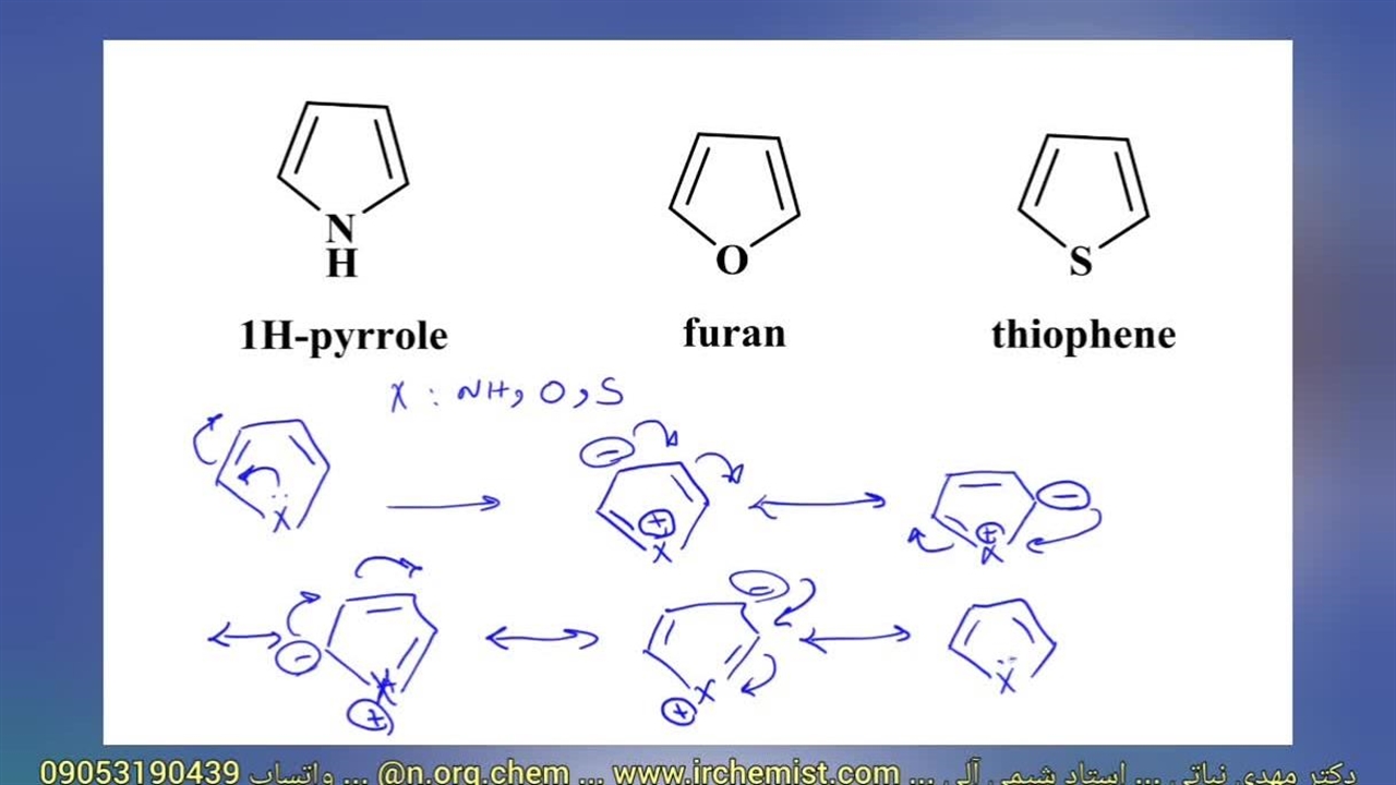 بررسی پایداری پیرول، فوران و تیوفن - تدریس خصوصی شیمی آلی - دکتر مهدی نباتی