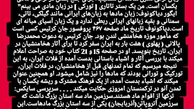 "زبان ماد _ زبان مادها _ زبان مادی _ مادها به چه زبانی حرف میزدند هنری راولینسون در کتاب" خط میخی کتیبه فارس در بیستون" در مورد خط دیگر کتیبه یعنی خط مادی در صفحه 34 و 35 مینویسد: ️The particles are frequently the very same as those which are employed in modern turkish. The pluralizing particles are also nearly similar , and i oercieve an occational introduction of a tartarian ground ️ترجمه: "اجزای زبان [مادی] غالبا عین آنهایی است که در زبان ترکی مدرن شاهد آن هستیم. اجزای جمع بستن در ترکی و مادی یکسان است. من یک بستر تاتاری [ تورکی ] در زبان مادی می بینم" ایگور دیاکونوف: زبان مادها به زبانهای ایرانی مانند گیلکی، تاتی، سمنانی و بقیه زبانهای ایرانی ربطی ندارد و یک زبان آسیای میانه ای است.دیاکونوف تاریخ ماد صفحه ۴۶۷ پروفسور جان کرتیس کسی است که مأمور موزه هخامنشی لندن بود. جان کرتیس به دعوت محمدرضا پالانی ( پهلوی ) هفت بار به ایران سفر کرد تا برای آثار هخامنشیان در ایران، تاریخ بنویسد. او در صفحه 15 و 21 کتاب خود به صراحت اعلام میکند با بررسی آثار و اشیاء باستانی بدست آمده از فلات ایران، به این نتیجه میرسیم که تمام تمدنهای قبل از هخامنشیان، در فلات ایران، تورکیک و تورانی بودند که مادها را نیز شامل میشود. او همچنین عنوان میکند که اشیاء بدست آمده، از یک فرهنگ مشترک و ریشه یکسان با تمدن آنو در ترکمنستان امروزی حکایت میکند . . . . سرپرسی سایکس: ترکها از اقوام ماد هستند.سرزمین ماد سه استان بزرگ داشت که سرزمین آتروپاتن(آذربایجان) یکی از سه استان بزرگ مادهاست.این مردمان اکثرا" پوستی روشن و قامتی بلند دارند امروزه تئوری مینورسکی در ماد بودن کُردها بطور کل، چه از دید زبانشناسی و چه از دید تاریخی و دانش مردمشناسی و باستانشناسی، بطور کل رد و نادرست اعلام شده است، از جمله از سوی مارتین ون بروئنسن (Martin van Bruinessen)، مردمشناس و کردشناس هلندی، گرونت ویندفور (Gernot Windfuhr)، ایرانشناس و زبانشناس آلمانی، مایکل گونتر (Michael M. Gunter)، کردشناس و زبانشناس آلمانی، که ماد بودن کُردها را یک افسانه همانند داستان جن و سلیمان خوانده است"