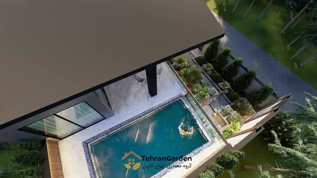 طراحی نما و محوطه ویلا در گیلان به سبک مدرن در زمین شیب دار با متراژ 308 مترمربع با المان های استخر، لمکده، باغچه های پلکانی و نورپردازی مدرن