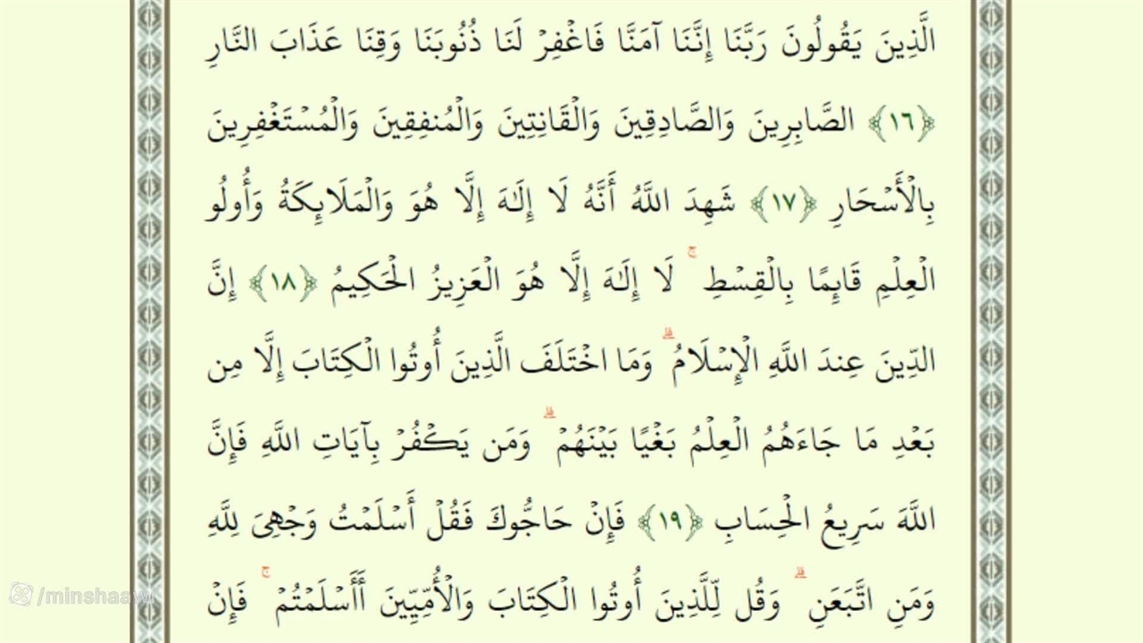 الَّذِینَ یَقُولُونَ رَبَّنَا إِنَّنَا آمَنَّا فَاغْفِرْ لَنَا ذُنُوبَنَا وَقِنَا عَذَابَ النَّارِ ﴿١٦﴾ الصَّابِرِینَ وَالصَّادِقِینَ وَالْقَانِتِینَ وَالْمُنفِقِینَ وَالْمُسْتَغْفِرِینَ بِالْأَسْحَارِ ﴿١٧﴾ شَهِدَ اللَّهُ أَنَّهُ لَا إِلَٰهَ إِلَّا هُوَ وَالْمَلَائِکَةُ وَأُولُو الْعِلْمِ قَائِمًا بِالْقِسْطِ ۚ لَا إِلَٰهَ إِلَّا هُوَ الْعَزِیزُ الْحَکِیمُ ﴿١٨﴾ إِنَّ الدِّینَ عِندَ اللَّهِ الْإِسْلَامُ ۗ وَمَا اخْتَلَفَ الَّذِینَ أُوتُوا الْکِتَابَ إِلَّا مِن بَعْدِ مَا جَاءَهُمُ الْعِلْمُ بَغْیًا بَیْنَهُمْ ۗ وَمَن یَکْفُرْ بِآیَاتِ اللَّهِ فَإِنَّ اللَّهَ سَرِیعُ الْحِسَابِ ﴿١٩﴾ فَإِنْ حَاجُّوکَ فَقُلْ أَسْلَمْتُ وَجْهِیَ لِلَّهِ وَمَنِ اتَّبَعَنِ ۗ وَقُل لِّلَّذِینَ أُوتُوا الْکِتَابَ وَالْأُمِّیِّینَ أَأَسْلَمْتُمْ ۚ فَإِنْ أَسْلَمُوا فَقَدِ اهْتَدَوا ۖ وَّإِن تَوَلَّوْا فَإِنَّمَا عَلَیْکَ الْبَلَاغُ ۗ وَاللَّهُ بَصِیرٌ بِالْعِبَادِ ﴿٢٠﴾ إِنَّ الَّذِینَ یَکْفُرُونَ بِآیَاتِ اللَّهِ وَیَقْتُلُونَ النَّبِیِّینَ بِغَیْرِ حَقٍّ وَیَقْتُلُونَ الَّذِینَ یَأْمُرُونَ بِالْقِسْطِ مِنَ النَّاسِ فَبَشِّرْهُم بِعَذَابٍ أَلِیمٍ ﴿٢١﴾ أُولَٰئِکَ الَّذِینَ حَبِطَتْ أَعْمَالُهُمْ فِی الدُّنْیَا وَالْآخِرَةِ وَمَا لَهُم مِّن نَّاصِرِینَ ﴿٢٢﴾