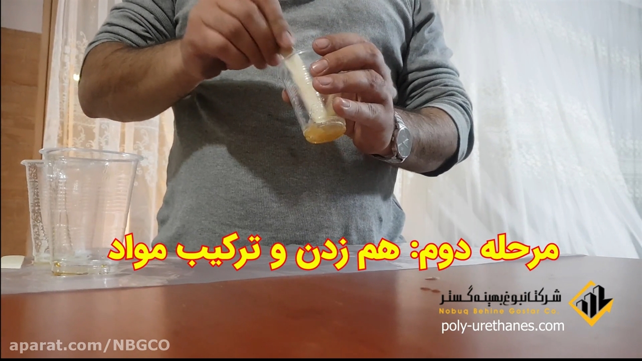 در این آزمایش آقای مهندس حسینی مواد مربوطه را بصورت دستی با هم ترکیب نموده و فوم پلی یورتان تشکیل می شود.