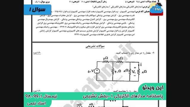 ویدیو حل تستی-تشریحی سوالات امتحان درس مدارهای الکتریکی، مدارهای الکتریکی1، برای دانشجویان پیام نور